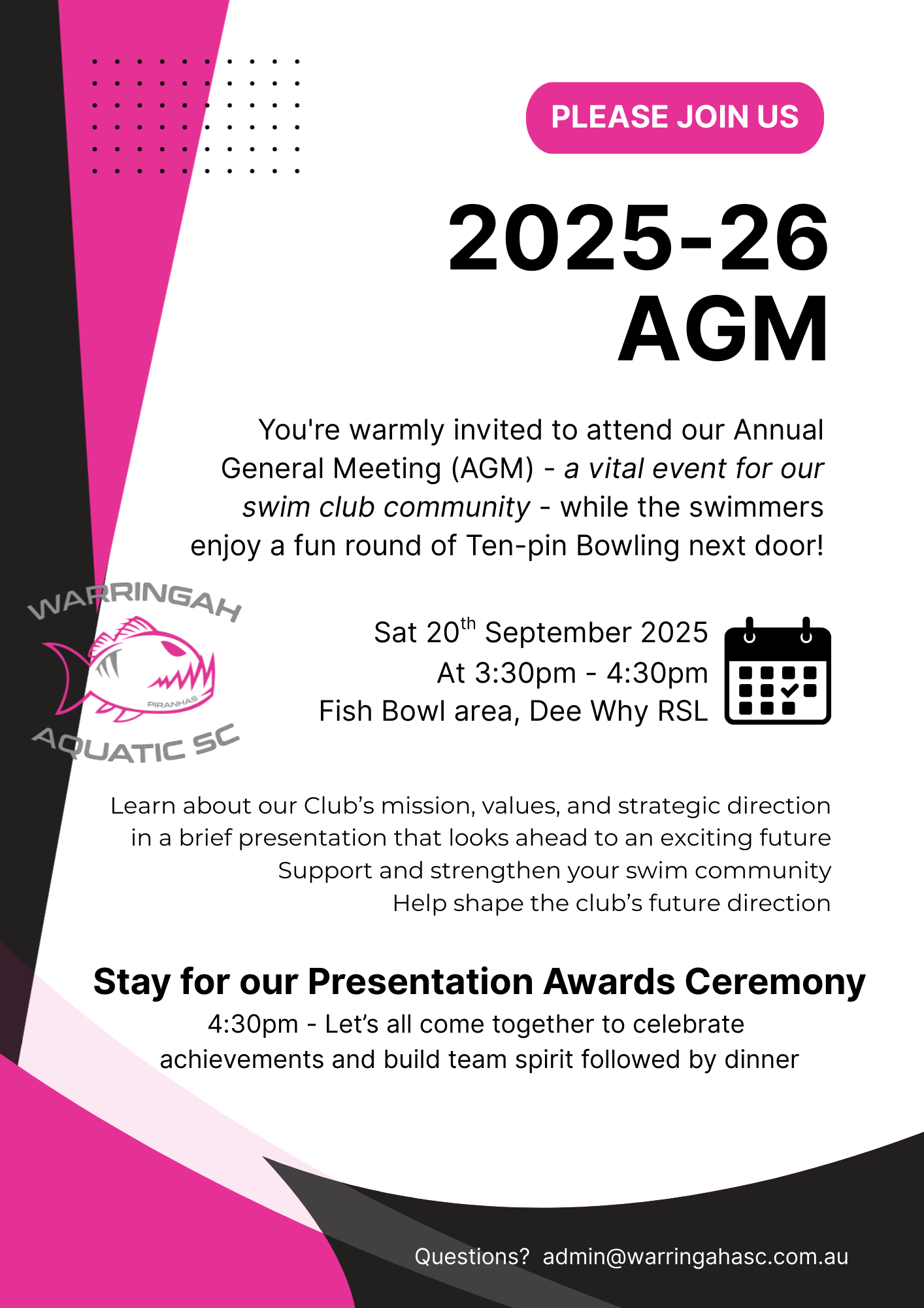 We hereby give notice that the Warringah Aquatic Swim Club 2025-26 AGM will be held on the above date.  All members are welcome and encouraged to attend. Learn about our Club’s mission, values, and strategic direction in a brief presentation that looks ahead to an exciting future.