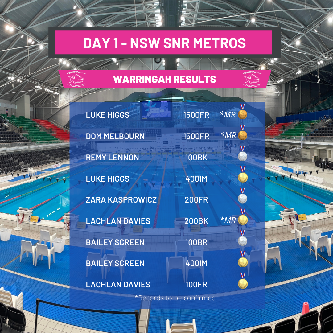 Day 1 saw our Piranhas earn 4 Gold, 3 Silver and 2 Bronze medals along with 20 other Top 10 finishes. Luke H, Dom M & Lachlan D showed them who was boss when they set 3 new NSW Metropolitan records.