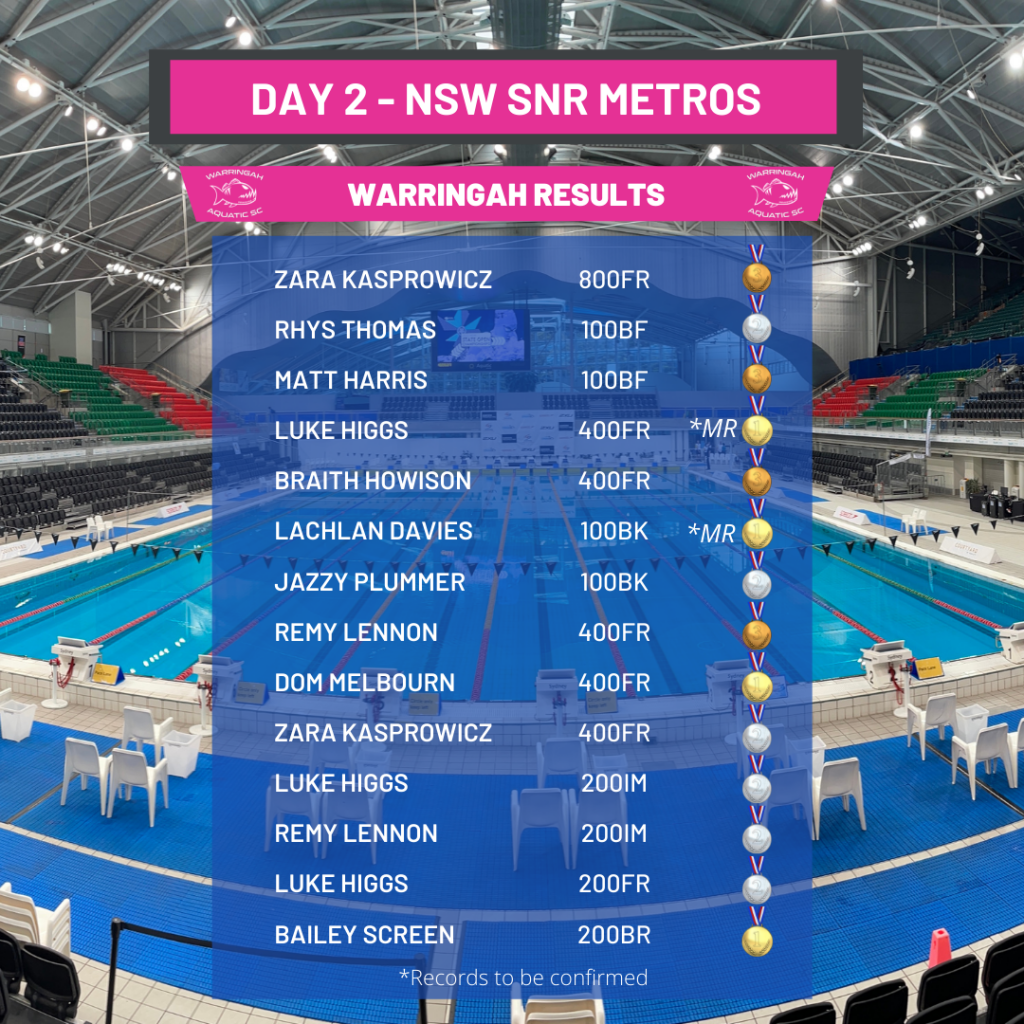 Day 2 continued with the successes in the pool with the senior swimmers adding 4 Gold, 6 Silver, & 4 Bronze medals to the tally as well as 13 other Top 10 finishes. Luke H & Lachlan D broke another two NSW Metropolitan records to add to their collection and the weekend culminated with us being named 3rd overall in the Combined Metropolitan point score – what an amazing achievement!